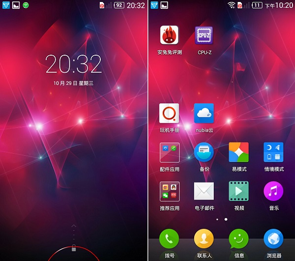 中兴V5S系统界面图标采用的是扁平化和拟物化相结合,图标根据功能分类不同,通过方形和圆形来区分。nubia UI采用二级菜单,解锁后直接进入程序菜单,图标设计上采用圆形和方形两种设计方案,使整个应用列表看上去既简单清爽又不单调。