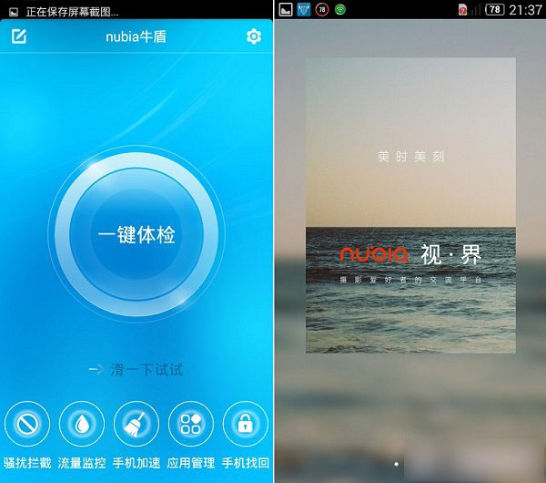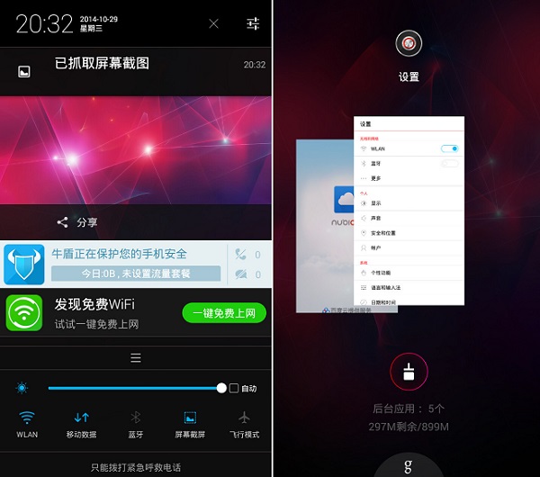 另外中兴V5S的nubia UI系统还自带电工、牛盾以及nubia视界等nubia经典软件,另外同样支持分屏、简易模式(老人)功能等,如下图所示。