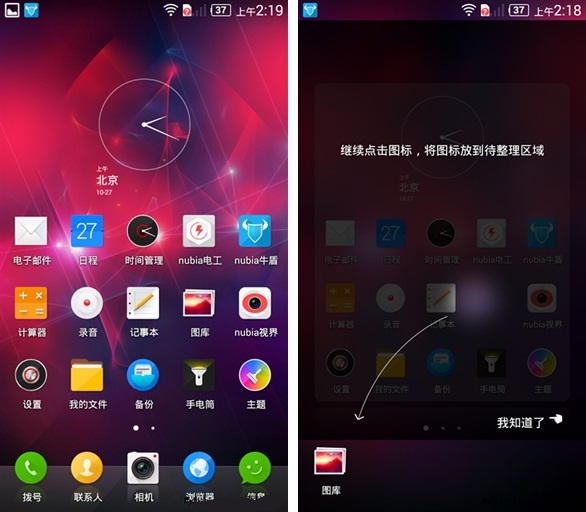 同时,nubia UI 2.6系统提供了便利的图标整理功能,可以将图标逐个放入整理区,然后切换屏幕再释放到桌面,整理起来非常的便利