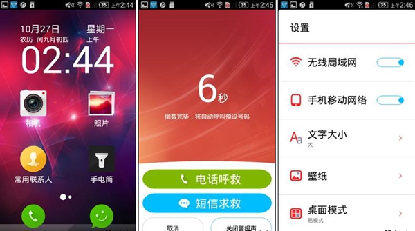 不能不说的还有一个“老年模式”,该模式下图标和文字都变的相当大,而且提供了“救援”功能,设置好自己手机号后,父母点击图标即可向你呼救。