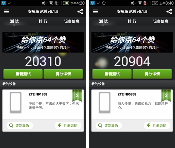 因为中兴V5S和中兴V5 Max采用同一处理器,因此在性能方面没有什么差异,安兔兔5.1跑分均在20000分出头,比上代产品中兴V5高出3000分左右。
