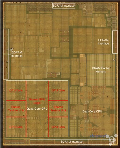 这款 A8 的芯片的面积主要是由 CPU,GPU 和 SRAM 组成,其余的空间则被苹果一些整合的设计部件占据。而目前我们很难发现这些区域是整合了什么东西,但我们会在这其中发现音频控制器,USB 控制器,视频编码/解码器,闪存控制器,相机 ISP 和各种各样的线。