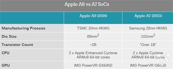 与此同时苹果今年再一次地公开了芯片的面积和晶体管的数量。A8 大约有 20 亿个晶体管,与之相对的是 A7 的“超过 10 亿个”--89 平方毫米的面积,这比 A7 的 102 平方毫米减少了 13%。这证明苹果选择在增加功能/性能和减少大小之间选择了分离晶体管的密度,而不是集成在一起。