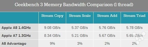 而内存带宽方面,我们发现 A8 的内存带宽要比在 A7 使用的高,但提升不大。这可以看出苹果试图更好地对内存带宽进行优化。