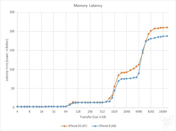 而 A8 在记忆体子系统方面的设计相比 A7 并没有显著的变化。苹果再一次在芯片上放置了 SRAM 缓存来为 CPU 和 GPU 服务。基于对芯片和延迟数的检测,L3 SRAM 缓存依然和 A7 的一样,停留在 4MB。同时我们发现一系列的 SDRAM 接口使得 A8 的 POP (堆叠封装)依然基于主内存。从 iFixit 的拆解可发现,苹果依然使用LPDDR3-1600的1GB内存,这和 LPDDR3 的是同一个速度级别。iFixit 还发现 Hynix 和 Elpida 的内存出现在手机中,这证明苹果再一次使用不同供应商的 RAM(内存)。