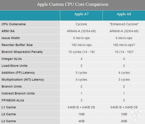 不管怎么说,能够确定的是 Enhanced Cyclone 有点不像苹果的风格,芯片在从 28nm 的 A7 换到 20nm 的 A8 以后,变得比以前小得多。A8 CPU 部分的面积约为 12.2 平方毫米,较之 A7 的 17.1 平方毫米减小了 29%。即使这个数据并不严谨,也足以说明 A8 在塞入了更多晶体管之后,面积反而更小了。尽管 A8 的晶体管数量不会比 A7 多多少,但这足以说明在 Cyclone 之后苹果的工艺又进步了。