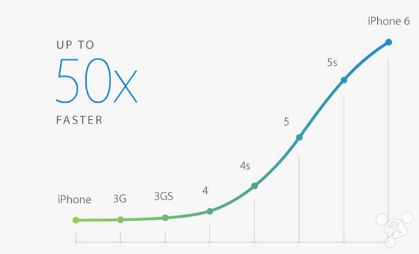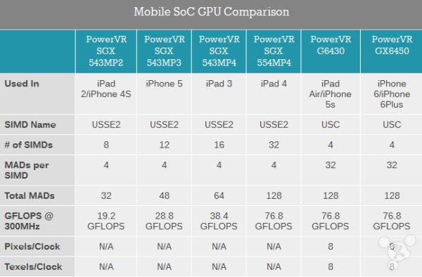 从 A7 的 G6430 开始,尽管苹果仍然只坚持使用四个 GPU 核心,但产品的性能一直获得不断的改善和提升。归因于 Series6XT 架构以及时钟速度提升相结合,A8 在 GPU 性能上获得了更多的发挥空间。iPhone 6 屏幕的增大以及增加的分辨率都要求更高的性能支持。同时,G6430 显然也推动了iPad Air更大 2048×1536 像素的屏幕支持。