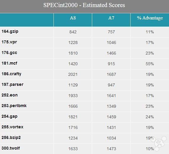 如图所示,需要记住的是 A8 的主频要比 A7 高 7.7%,但 SPECint2000 的测试结果却显示 12 个子项的提升均大于这个比例,证明它们在某些方面都得到了额外的加强。在这些子项里 MCF、GCC、PerlBmk 和 GAP 提升最大,幅度从 20% 至 55% 不等。大略来说,这应该是多个小提升相乘所得到的结果。