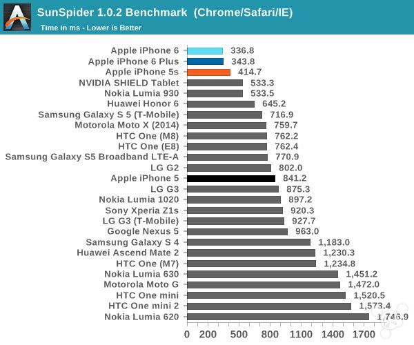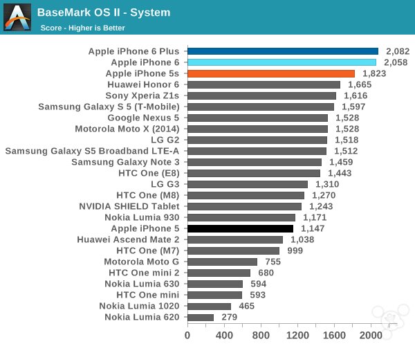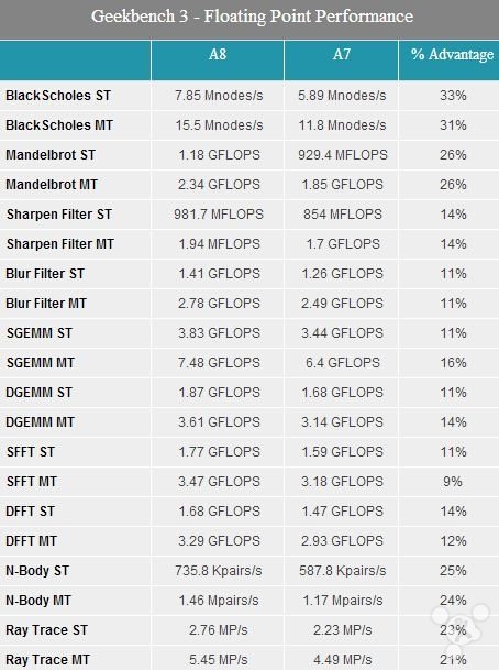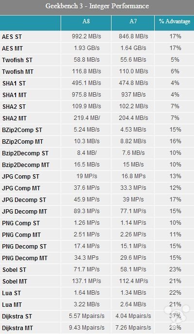 在大多数情况下,尽管主频较低(1.38GHz)和相比其它有竞争力的 SoC 在核心数量上较少,但 A8 的表现依然出色。看起来这主要是建立在 A7 的 Cyclone 架构的领先水平的基础上。至于其它的 SoC 生产商是否能够在某个时候迎头赶上还有待观察,至少在现在,苹果在 CPU 方面的性能是领先蛮多的。