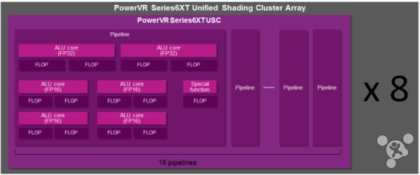 对于Series6XT,Imagination已经对USCs结构本身进行了部分改进。 Series6XT 仍然使用 16 脚宽的SIMD设计,但在他们已经在每一个管道上添加了另一组介质/半精度(FP16)算术逻辑处理单元(ALU)以此来改善 FP16 性能。现在,Series6XT 全新的4X2(8)FP16 ALU已经取代了2x3(6)。