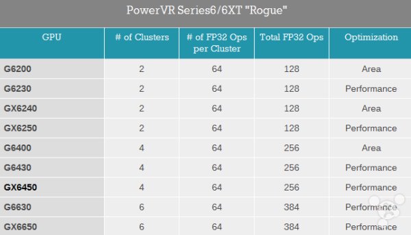 从技术角度上来分析,全新的Series6XT已经成为PowerVR图形处理器架构的新一代产品,它对于前一代Series 6图形处理单元是一个直接的进化,而GX6450同样也成为G6430最直接的继任者。苹果仍然在A8中采用四核心GPU,虽然在其20nm制程上,配置面积仅为19.1mm2的GX6450比22.1mm2的G6430更能节省不少空间,但GX6450相比G6430的硬件规格拥有更高的复杂性以及额外的ALU/SRAM。显然Series6XT重点在增加功能以及提高性能,那么它需要通过对架构进行各种调整和优化才能得以实现。相比之下,两年前问世的Series6架构在这一点已经过时。