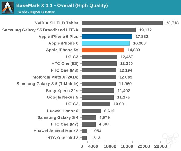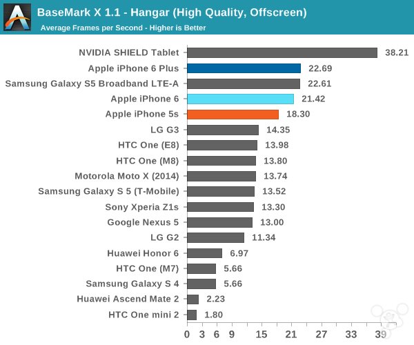 编辑的话:在得出结果之前,必须要注意的是 Basemark X 的屏幕上的结果可能不准确,这是因为基准评分是使用了 XCode5.x 来让版本 1.1 和版本 1.1.1 的得分保持可比较性。但这不会影响整体分数,这是基于真实的性能单独计算的。