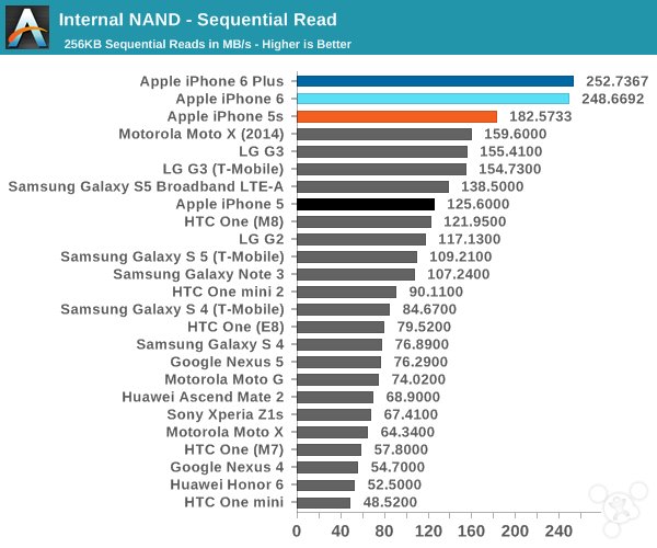 实际上,平板和智能手机的多任务操作远没有 PC 或者笔记本频繁,所以顺序读写得分可能更能直接反应总体的用户体验。而 iPhone 6 的结果相比iPhone5s在所有测试中都有显著的提升,这也是我们喜闻乐见的。