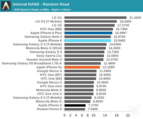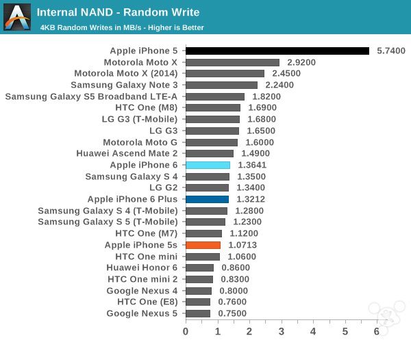 因为这是我们第一次在 iOS 设备上进行 NAND 性能的测试,所以特别值得仔细检查这些数据。iPhone 6 上使用的 NAND 可以说得上是一流的顺序读取和写入速度,但随机读写速度只是属于中等。