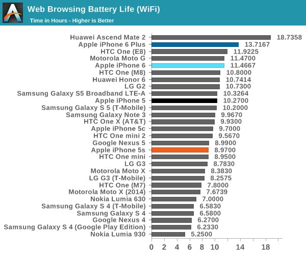 我们的第一个测试是在 WiFi 条件下浏览网页。正如所见,电池容量相对较小的iPhone 6所表现出来的续航能力还是相当令人惊讶的。看来苹果官方公布的电池数据还是有些保守的,因为本项测试中我们将有望超出此前预期的电池寿命。不少用户可能认为这看起来有些奇怪,因为iPhone 6所配备的较小容量电池很难能够发挥出这样出色的表现,因此我们在此有必要说明,该项测试的目的是避免手机使用更快的SoC和数据连接。