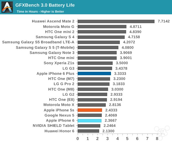 尽管网页浏览测试体现了 iPhone 6 电池在密集型任务显示上的续航能力优秀,但或许在强度更高的 SoC 密集启动中将面临更大的考验。为了观察 iPhone 6 在 SoC 高负载状态下的续航能力,我们转向了 GFXBench 测试,采用其中一个无限循环的测试模式。这个测试还提供了一个标称性能,不过可惜的是,我们目前还无法提供准确的 Basemark OS II 电池续航得分,因为当手机电池电量不足并在屏幕上弹出警告弹窗通知时,测试将会自动停止。基于这个问题,我们目前正在研究其他方法来绕过这个问题,相关的测试报告不久后才会呈现。