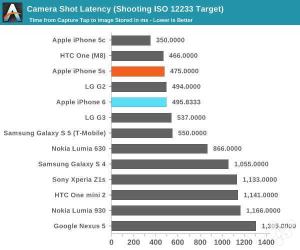 正如你所看到的,在对比中拍摄延时似乎并没有什么巨大的改变,但聚集延时却大幅度的提升到最优的程度,达到大约200毫秒。相比之下,三星银河S5确实也拥有PDAF,但很难判断它是否比另一款大部分基于对比度获得认可的HTC One M8 更快,但是PDAF却在iPhone6获得了非常优异的表现。在光线充足的条件下,相机始终会捕捉来对焦,而不是等待ISP检测出聚焦状态再发出指令然后进行自动对焦扫描。不过奇怪的是,在测试者所使用过的所有手动相机应用中,几乎没有哪一款能够在预览时使用连续自动对焦,这表明这并非相机API的暴露。