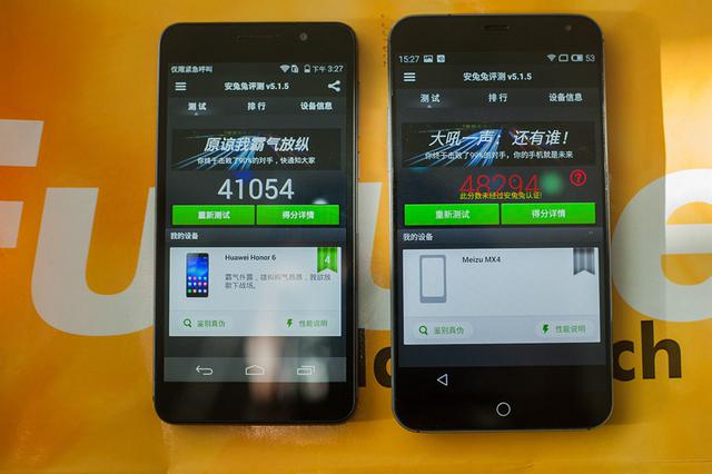 荣耀6是首款搭载华为自家Kirin 920八核处理器;魅族MX4采用独立的富士通双核ISP处理器,MT6595采用的是GC6200的双核图形处理器,跑分情况是这样的