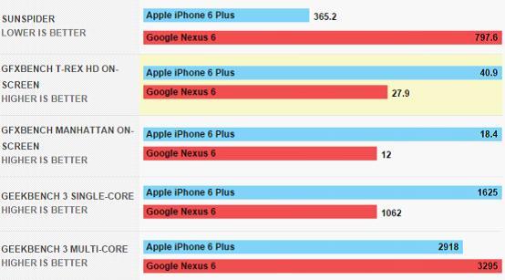 硬件方面,Nexus 6搭载了2.7GHz高通骁龙805四核处理器,3GB RAM;iPhone 6 Plus则为64位架构的1.4GHz A8双核处理器,1GB RAM。从参数上看,似乎Nexus 6更胜一筹,不过iOS经过一年的64位化,同时iOS设备通常用于更好的性能优化,所以在各种跑分软件测试中,两者得分各有千秋。不能否认的是,iPhone 6 Plus拥有更好的游戏性能。