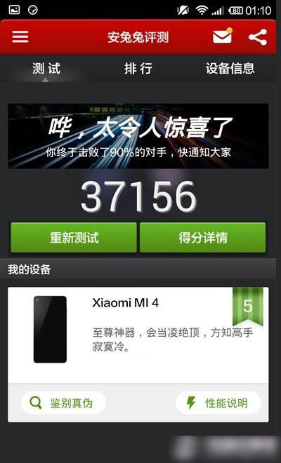 先来看看小米4跑分性能,小米4采用2.5GHz高通805四核处理器,运行3GB内存,在硬件配置属于时下智能手机的旗舰水平,不过搭载此类配置的旗舰手机已经有不少,使用新版安兔兔跑分软件测试后,小米4跑分成绩如下。