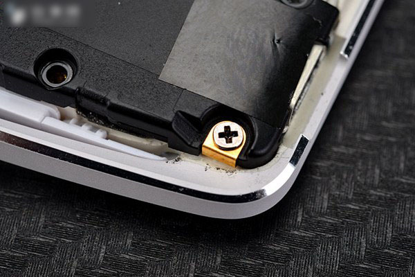 另外,在OPPO N3下方的螺丝位置有一个金属触点,这个触点是手机边框天线和手机PCB连接的位置,如下图所示。
