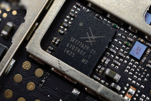 图为skyworks 77629-21是一颗多模功率放大芯片,支持四通道GSM/EDGE网络,主要负责手机第二张SIM卡的信号。