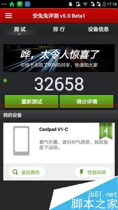 安兔兔跑分作为一款量化手机性能的软件还是有其优势的,酷派铂顿手机在2K分辨率屏幕的拖累下达到了32000+的分数,其性能可见一斑。