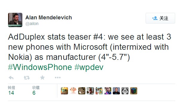 据外媒报道,AdDuplex即将发布最新一期有关Windows Phone的报告,AdDuplex创始人Alan Mendelevich分享了其中的部分细节信息,称其中将统计到至少3款微软新机,或包括微软最新的旗舰机型,如近期有关曝光的“Lumia1030”等。