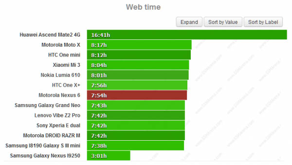 在连续上网时间环节中Nexus 6的测试结果将近达到8小时,作为比较Moto X(2014)的结果为8小时17分钟,Galaxy Note 4的结果为10小时44分钟;iPhone 6 的连续上网时间为10小时29分钟;iPhone 6 Plus的结果为9小时05分钟。