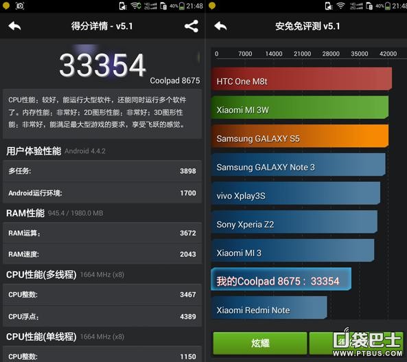在安兔兔v5.1的跑分测试环节,酷派大神F2最终成绩为33354分。为了展现酷派大神F2的实际测试效果,我们使用当下热门的NBA2K14进行了测试。总体来说,酷派大神F2的表现还算令我满意,只是在一些相对复杂的图形界面下,偶尔会出现少许卡顿的现象。在运行游戏30分钟之后,设备背部摄像头位置会有一定的发热,但也是在可以接受的范围内。