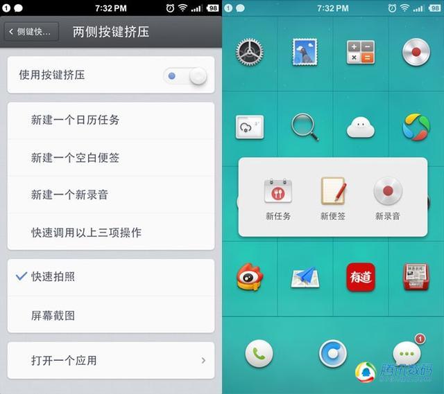 左右两个音量键同时按新增加了一个功能,弹出一个快捷操作栏,里面有包括日历、便签和录音三个快捷功能,还是挺方便的。