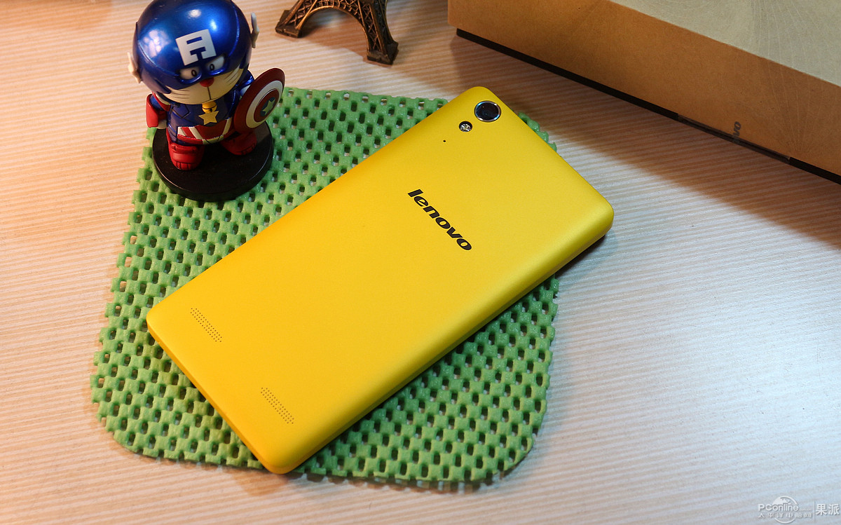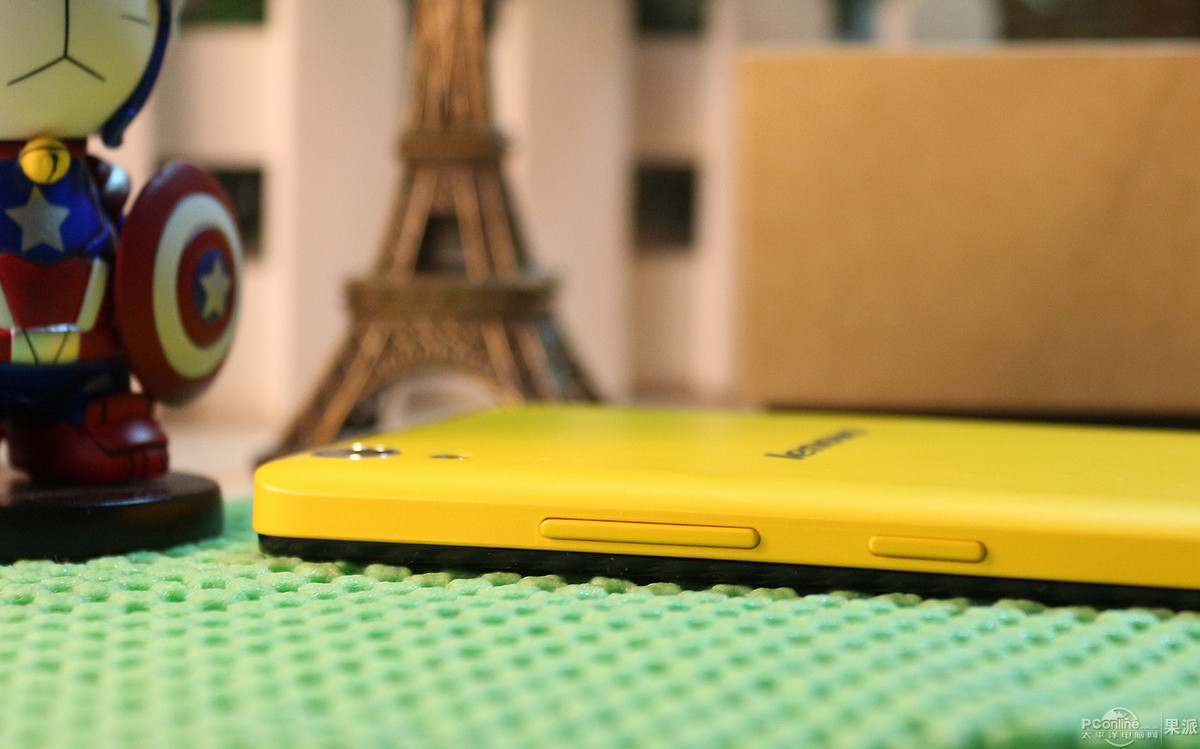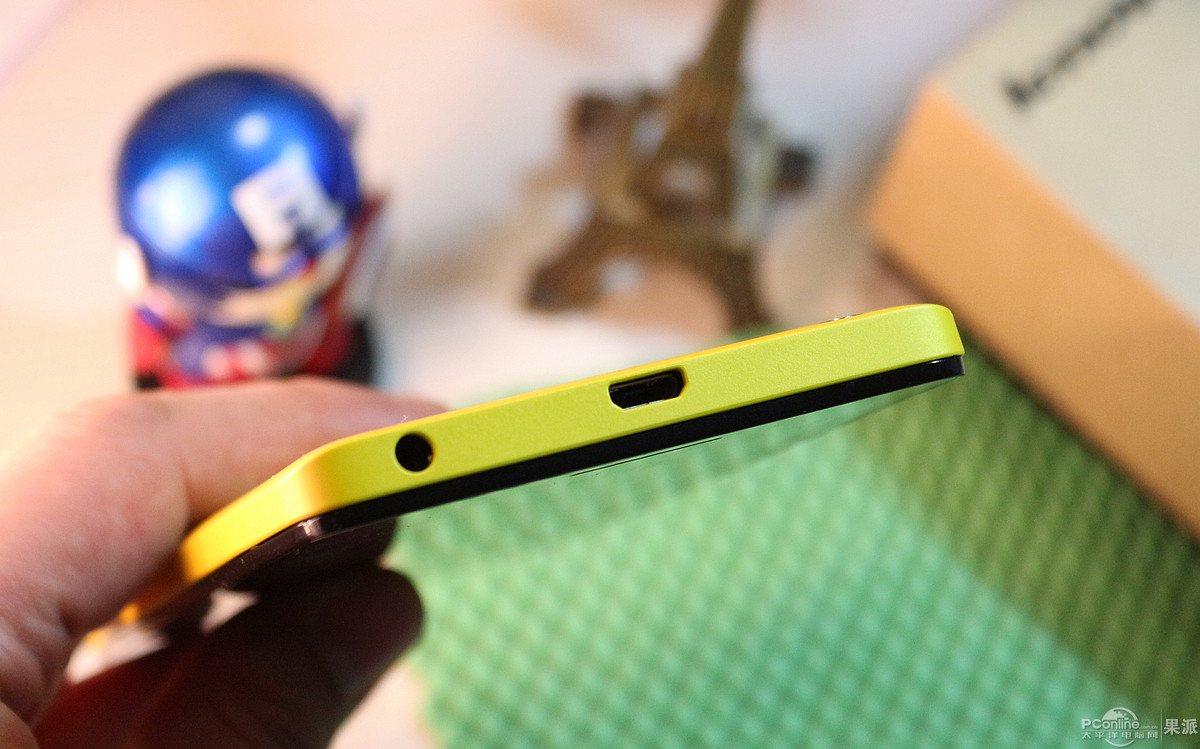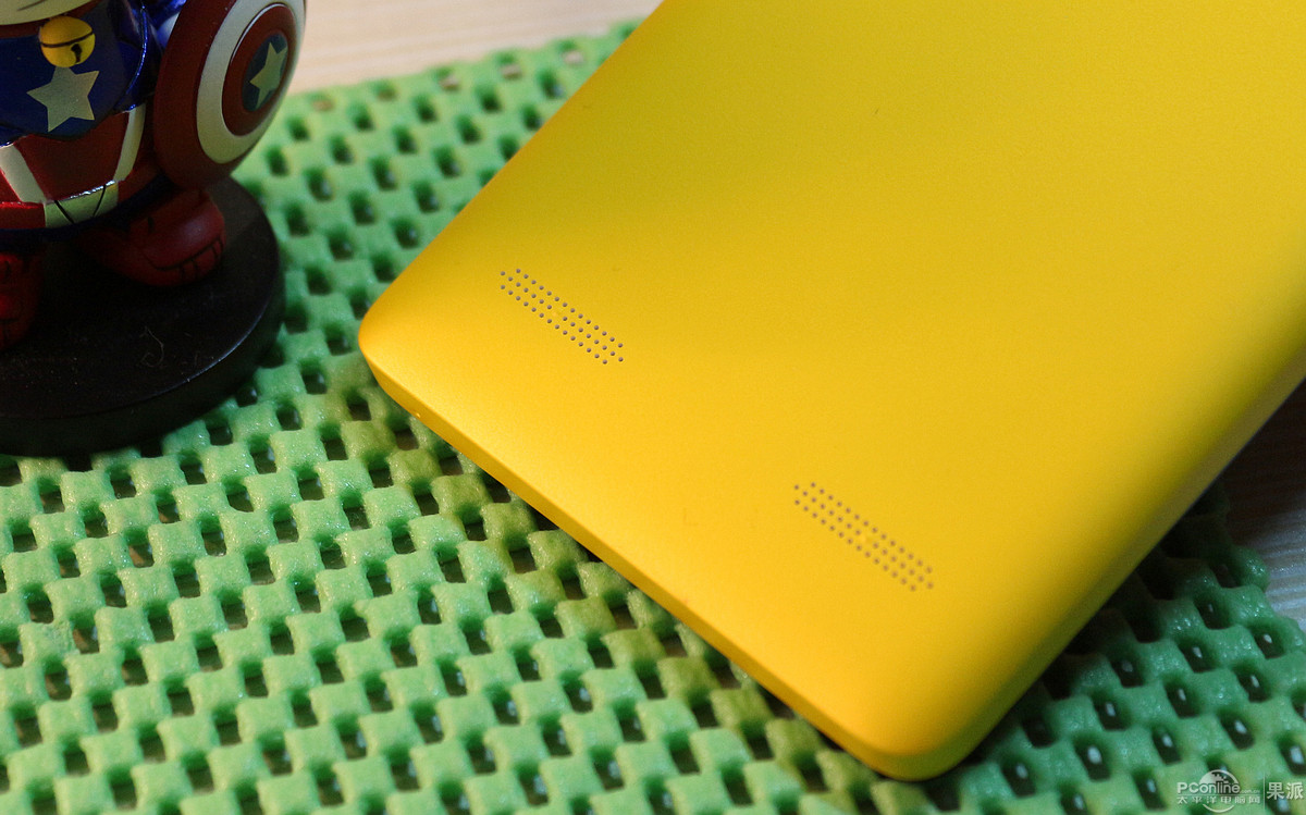 柠檬黄色的后盖采用塑料材质,但是略微的细磨砂处理令手感十分舒适,不易沾染指纹,清洁上也比较容易,看惯千篇一律的黑白色外观的手机,一抹柠檬黄足够给人眼前一亮的感觉。