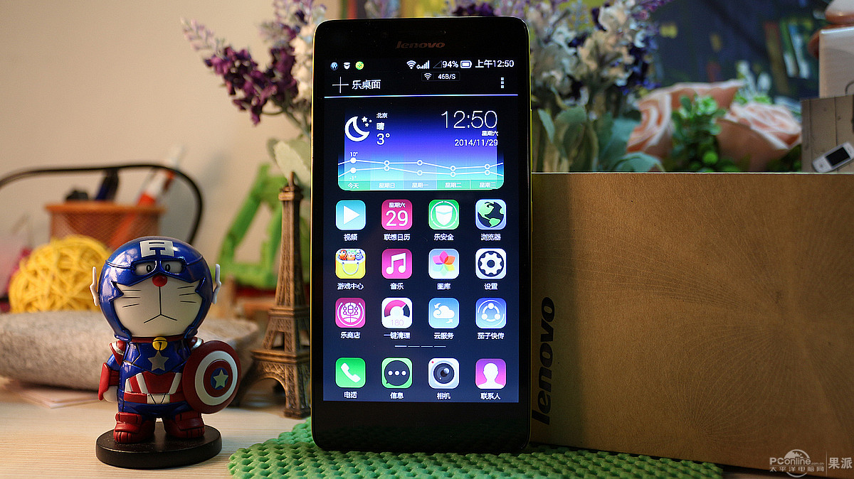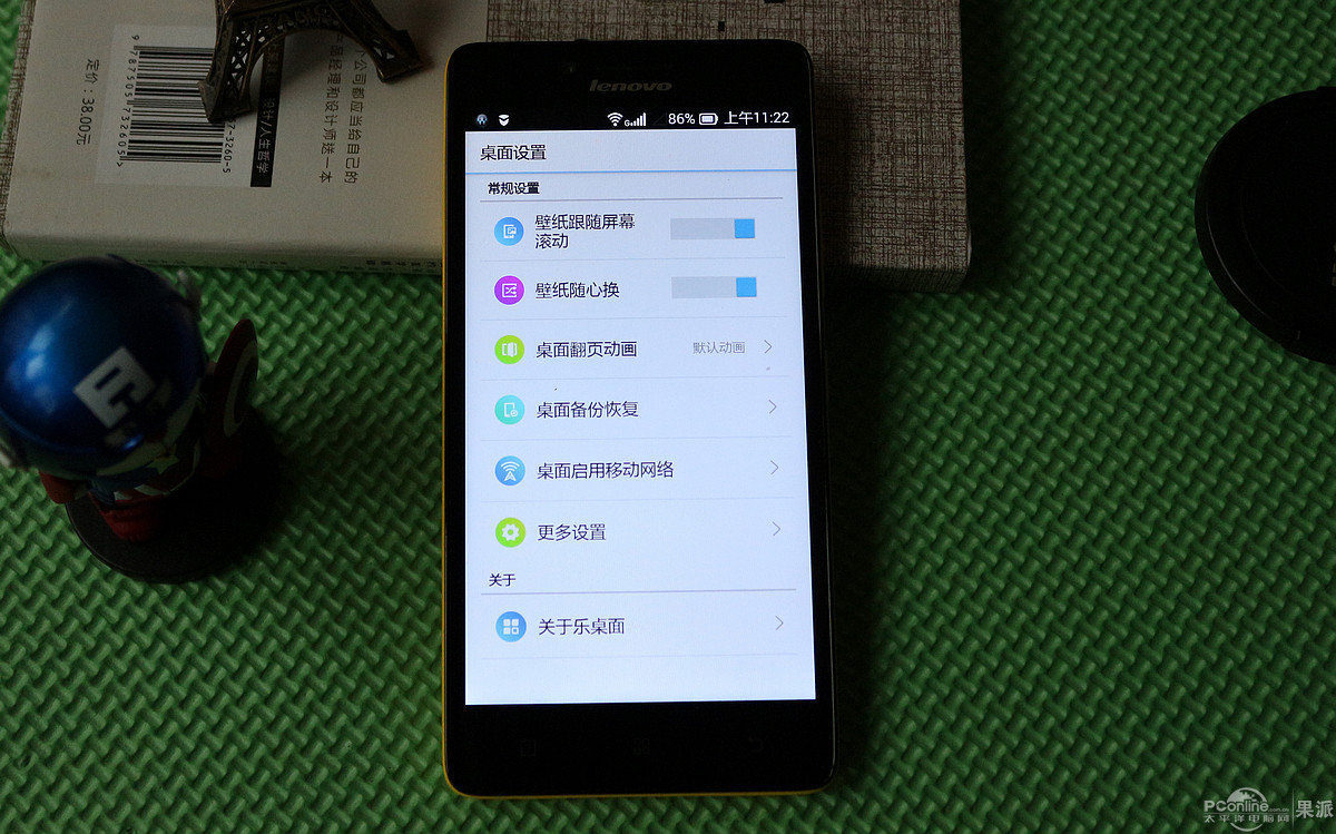 继续来看系统。联想乐檬K3使用了联想深度订制的VIBE UI,同样为目前流行的单级页面,操作上较便利,图标风格也趋于扁平化,不过默认主题图标实在说不上好看,而且加载的“乐桌面”占用系统资源较多,后台开着微信微博qq还有音乐等程序后系统内存占用就到80%了,需要经常清理后台,看来1G内存在使用中还是稍有些捉襟见肘的。
