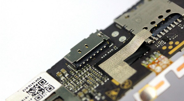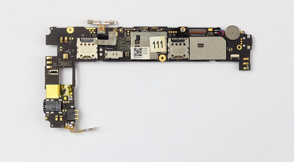 拆卸中兴V5S手机内部中框后,我们发现该机主板依然是采用黑色PCB板,相较绿色、蓝色板材而言,一般情况下黑色质量更好一些。