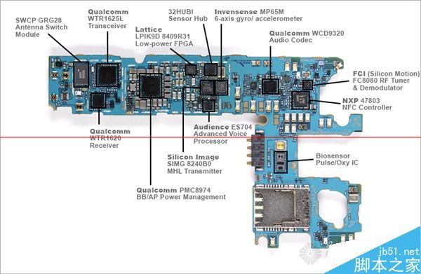 经过辨别,Galaxy S5里的大量芯片中有六颗来自高通,而且都是特别关键的,三星自己的只有内存、闪存。