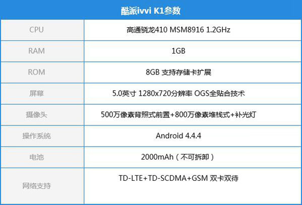 从硬件配备上看,ivvi K1配备5英寸720p电容屏,像素密度320ppi,搭载安卓4.4.4系统,采用64位高通骁龙410四核处理器,集成Adreno 306 GPU,内存配置1GB RAM+8GB ROM,支持micro sd卡扩展,内建前500W后800W双摄像头,感应器方面只有距离感应器、光线感应器以及加速度计,支持TDD-LTE 4G网络和双卡双待。