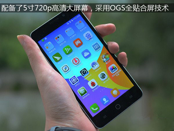 酷派ivvi K1整体采用了矩形圆角设计,正面配备一块5英寸720P黑钻屏,由于手机采用OGS全贴合屏技术,关闭屏幕时机身正面看不出屏幕的轮廓,感觉屏幕跟正面面板融为一体,几乎呈现纯黑的平面效果。同时屏幕采用康宁大猩猩第3代防刮玻璃面板,保证了手机屏幕的硬度,防止手机在口袋和包包中被硬物刮伤。