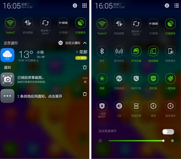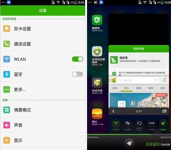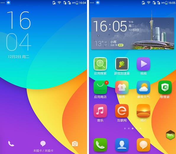 酷派ivvi k1搭载的是基于Android 4.4.4系统深度定制的Cool UI 5.5系统,Cool UI是酷派的定制UI,由于目标对象为年轻的用户群,所以Cool UI大面积的运用比较绚丽的色彩和圆润的设计风格。