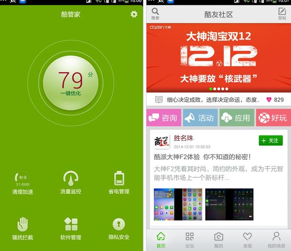 ivvi k1内置的酷管家应用可以对手机的状态进行实时监控,保护手机处于安全的状态下运营。酷管家可以设置骚扰拦截,让你屏蔽掉垃圾短信及骚扰电话的打扰。同时还有垃圾清理、流量监控、省电管理及软件管理等常用到的功能。K1还内置酷友社区应用,能随时随地的关注关于酷派手机的第一手信息。