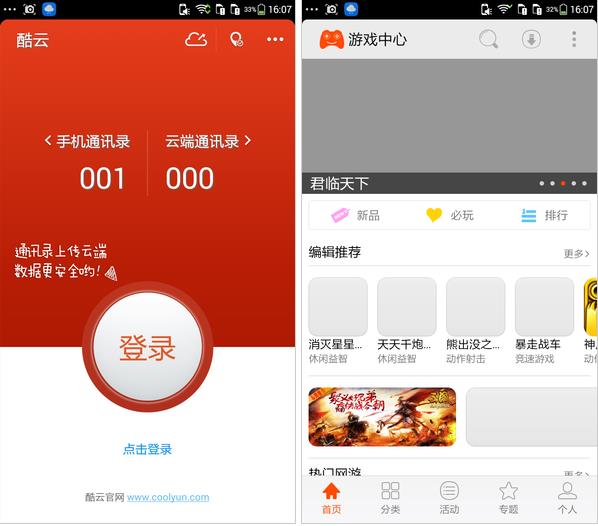酷派ivvi K1还预装了酷云、游戏中心等应用,这样能让大家更容易的上手。