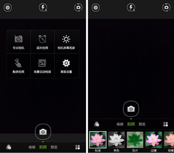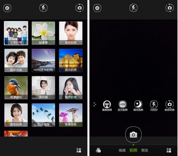 酷派ivvi K1的拍照界面进行了优化,整体上保留了原生android系统相机的格局,取景框分为三部分,上面部分由左向右分别是设置、闪光灯和前后镜头切换按键,下面部分部分由左向右分别是滤镜、视频/拍照/预览、拍照模式选择。这里提供了正常拍照、美容拍照、脸部优先拍照、背景移除、微笑拍照、轨迹拍照、画中画拍照、留声拍照、弱光拍照、HDR(逆光拍照)和动画拍照共计11中拍照模式,提升了拍照的乐趣。