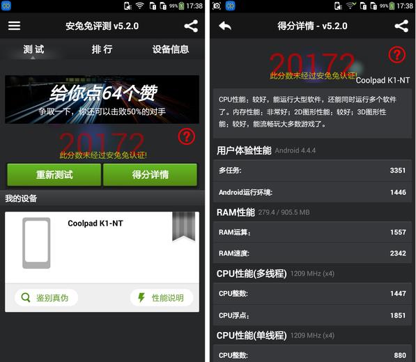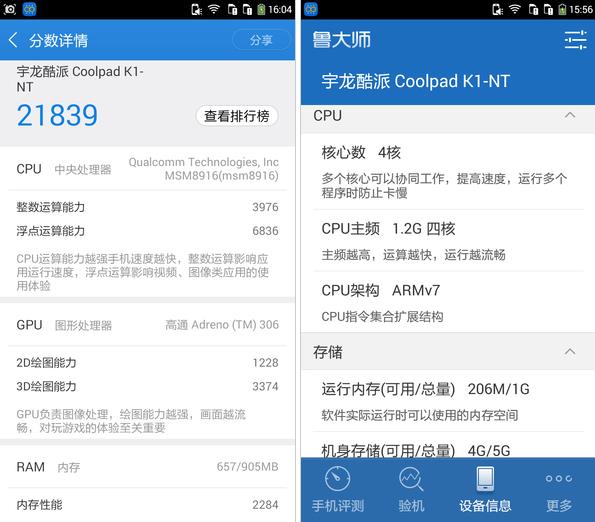 也许在跑分性能上,酷派iviv K1相比其他同类价位级别的机子上稍微逊色。不过现在对于大多数的手机用户来说,已经脱离的盲目追求硬件和跑分的阶段。ivvi K1的性能基本满足日常娱乐还是绰绰有余的。