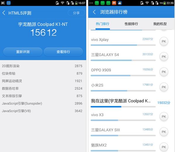 ivvi K1在鲁大师浏览器评测中达到了15612的分数,在分数上已超越了vivo X3,紧逼小米2S。