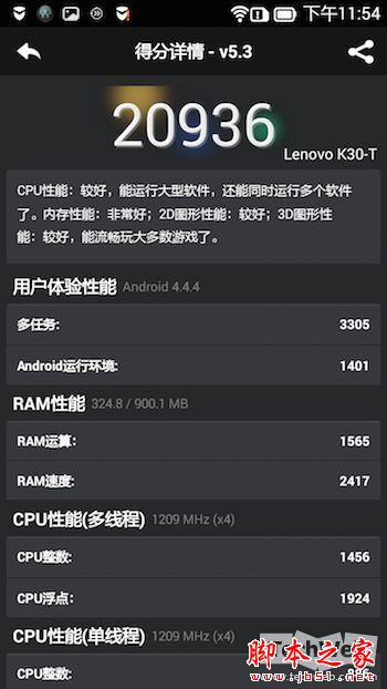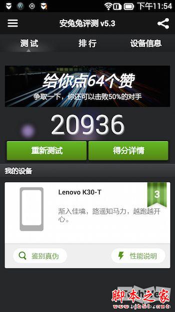 安兔兔性能测试是最常用的测试软件,里面涵盖了内存和闪存、CPU、图形、SD卡读取/写入等测试项目,并给出一个综合性分数。最后得出的分数,基本上能比较准确的表示你的手机属于那一个性能阶梯。在安兔兔测试中,联想乐檬K3的最终得分为20936分,与红米手机基本处于同一水平线上。