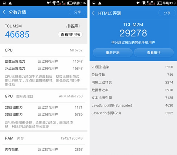 在以上跑分中可以看到,虽然MT6752是一款定位在中端级别的处理器,但是在性能方面是直接赶超高通骁龙801的水平。在鲁大师跑分中跑分破四万,而在安兔兔跑分中成绩也是直逼四万分,硬件性能十分不错。对于一款千元级别的机型来说,这样的表现已经是十分抢眼了。