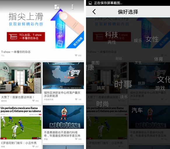 乐蛙OS 5.1此次是新加入了T-show的新闻源页面界面,只要从屏幕左侧滑动就可以呼出,用户可以自由定制喜欢的新闻源来进行阅读。