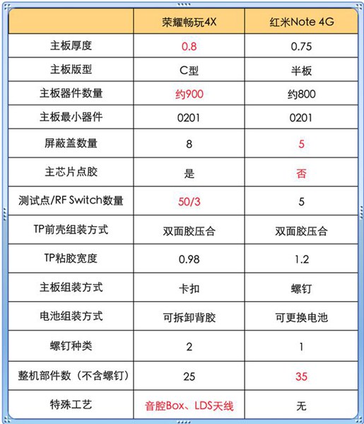 两部手机相比荣耀畅玩4X整机轻薄,握感更好,同样的5.5英寸下拥有更高的屏占比,显得时尚大气。工艺方面荣耀畅玩4X主板用料更扎实,而且主芯片采用了点胶工艺,而Note 4G则没有。测试点/RF Switch数量,荣耀畅玩4X的50/3 (50个主板测 试点和3 RF 测试点)测试也要更严格,且荣耀畅玩4X还采用了BOX一体化音腔+侧出音设计,让声音外放再无遮挡,音量强度提升近150%,低音浑厚圆润,音质更佳。