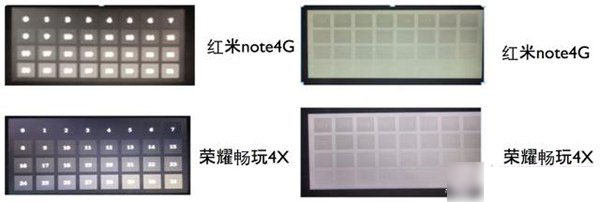 荣耀畅玩4X和红米Note 4G版都是拥有5.5英寸IPS屏幕,支持1280x720的分辨率,可以说是使用相同的屏幕,但是在屏幕调校上却有明显的不同。首先是对比度,红米Note 4G在高阶对比度上仅能辨识至251灰阶,而荣耀畅玩4X能辨识至253灰阶(越高越好);低阶对比度上红米Note 4G仅能辨识至6灰阶,而荣耀畅玩4X能辨识至4灰阶(越低越好)。