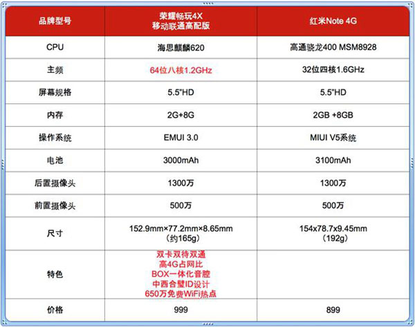 另外在网络方面,荣耀畅玩4X支持双卡双待双通,还有BOX一体化音腔等特色功能,而红米Note 4G则只采用了单卡设计,没有其它亮点动能,这一环节红米Note 4G又败一阵。