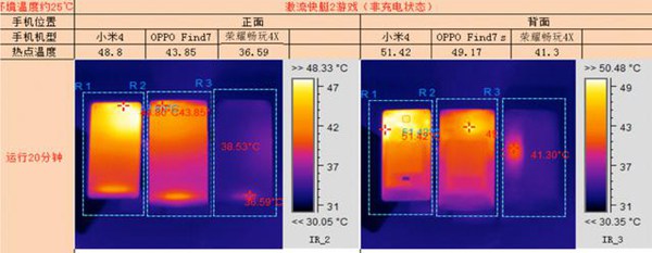后续燕山派还对多部手机进行了发热量测试,非充电状态,几部手机同时运行《激流快艇2》游戏,通过红外温度测试仪给出的红外图可以看出,荣耀畅玩4X的发热量与三星S5接近(差约0.5度),但大幅优于小米4、OPPO Find7、红米Note 4G,这要得益于荣耀畅玩4X的整机工艺和散热处理,当然还有麒麟620处理器本身的发热量低。